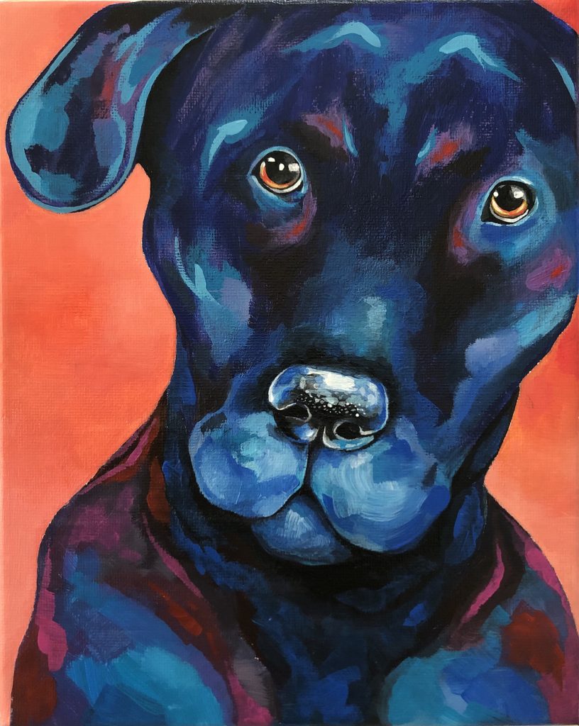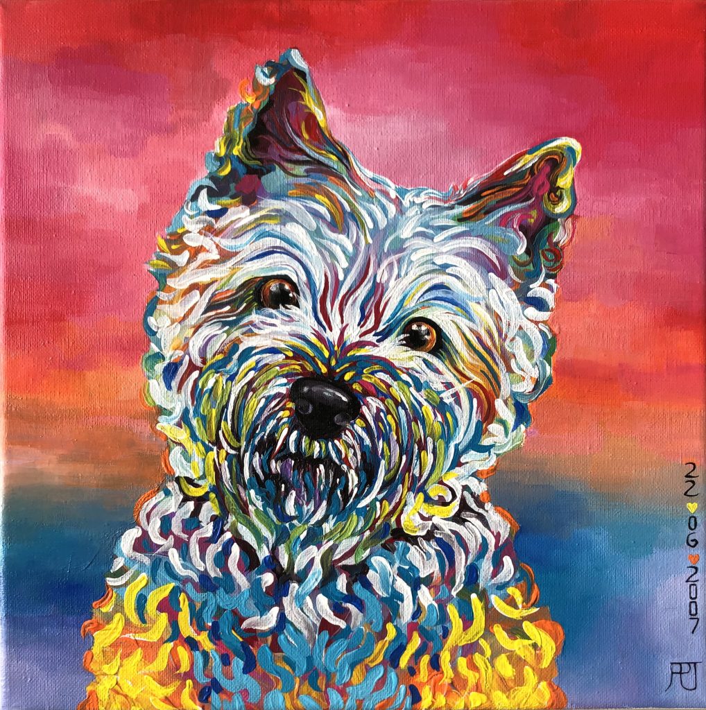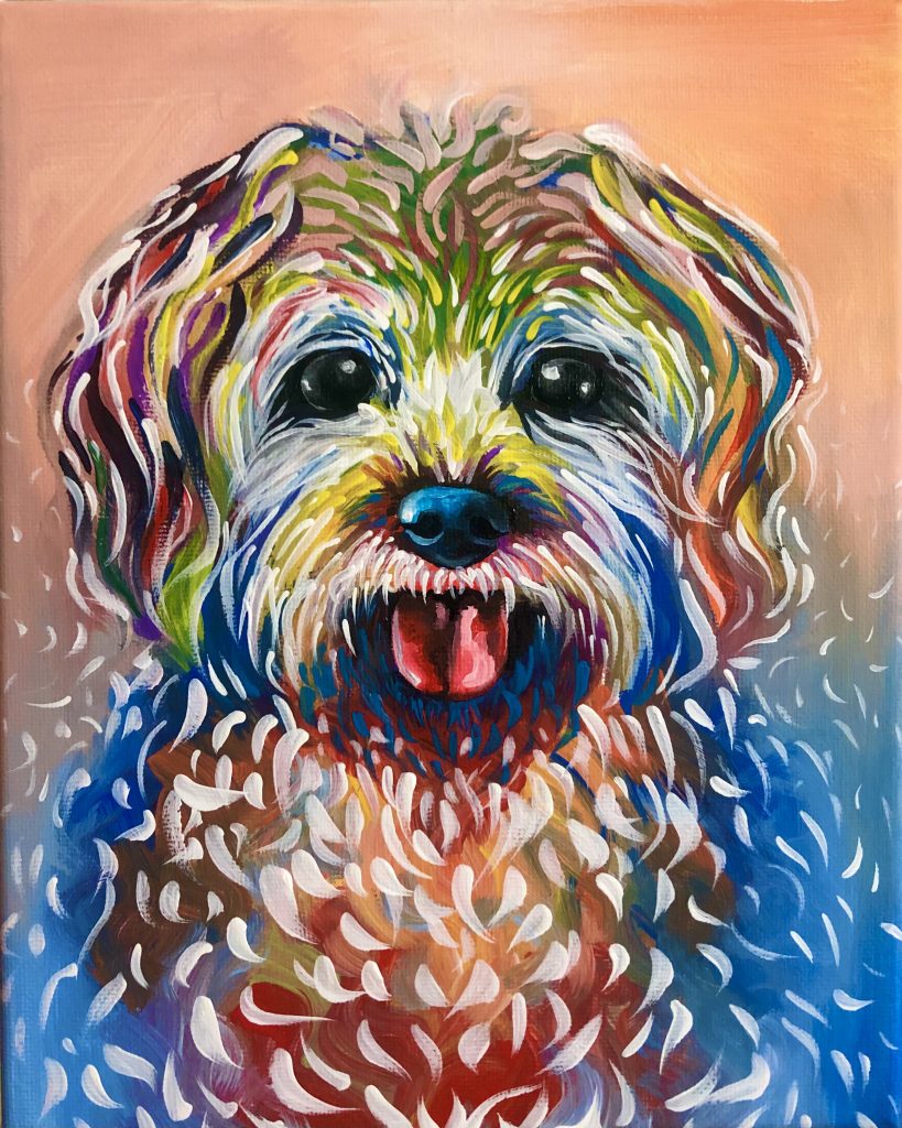 Por ejemplo los retratos de estos tres perritos los he realizados con una técnica muy colorida (pintura acrílica).
