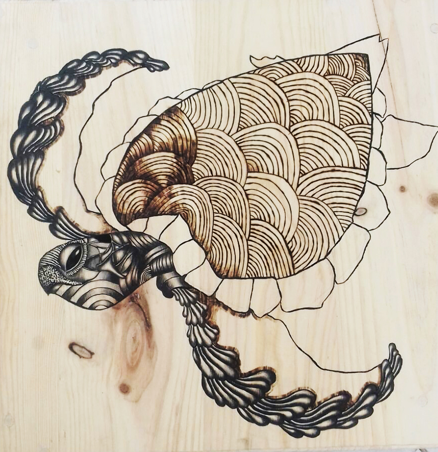 El pirogabador va quemando la madera con la ayuda de puntas de diverso grosor que simulan una pluma a una alta temperatura, dejando así un rastro de líneas y sombreados a diferentes intensidades.