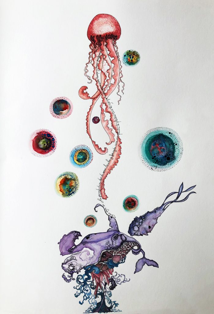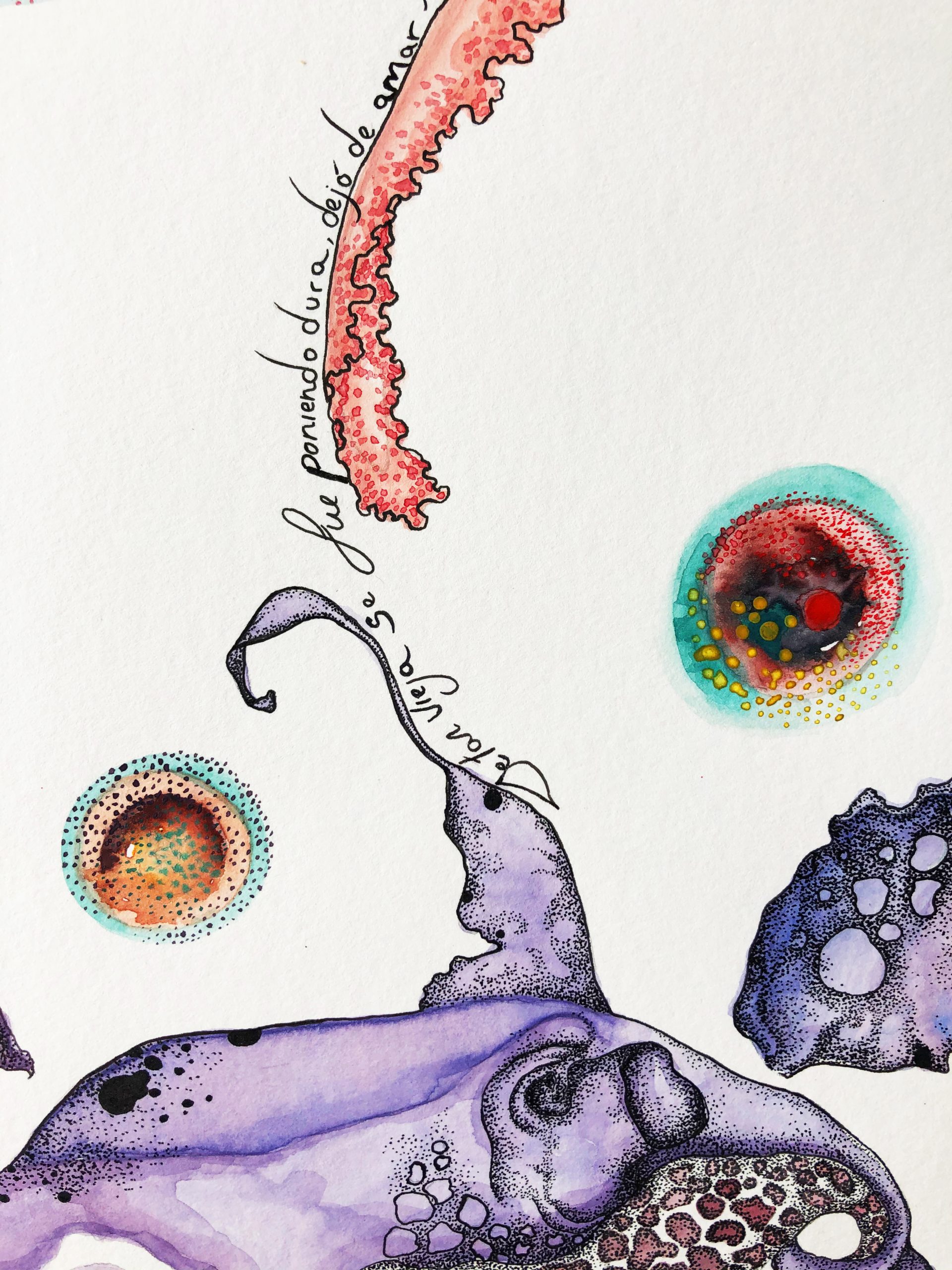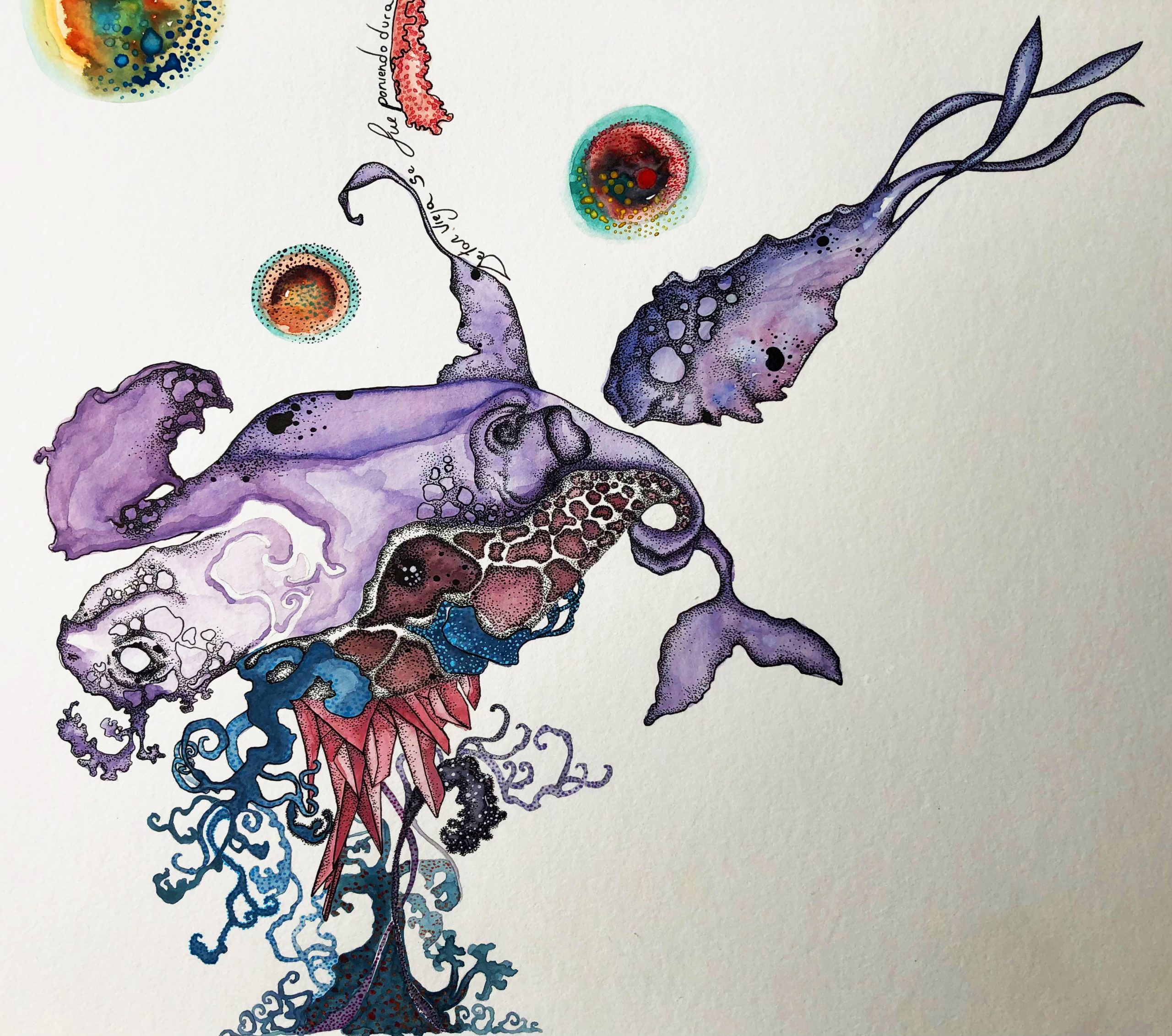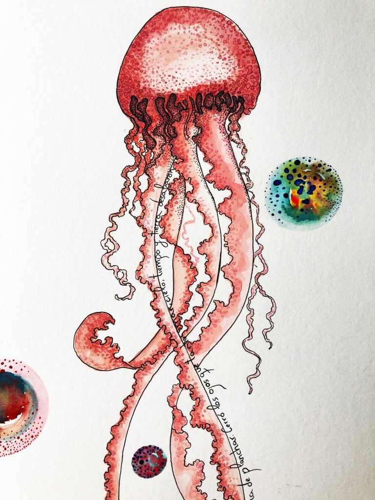 En segundo lugar podemos observar el poema ilustrado «La Tortuga», en el que se muestran dos elementos principales, una tortuga desfallecida tal cual relata el poema, y una medusa que la custodia.