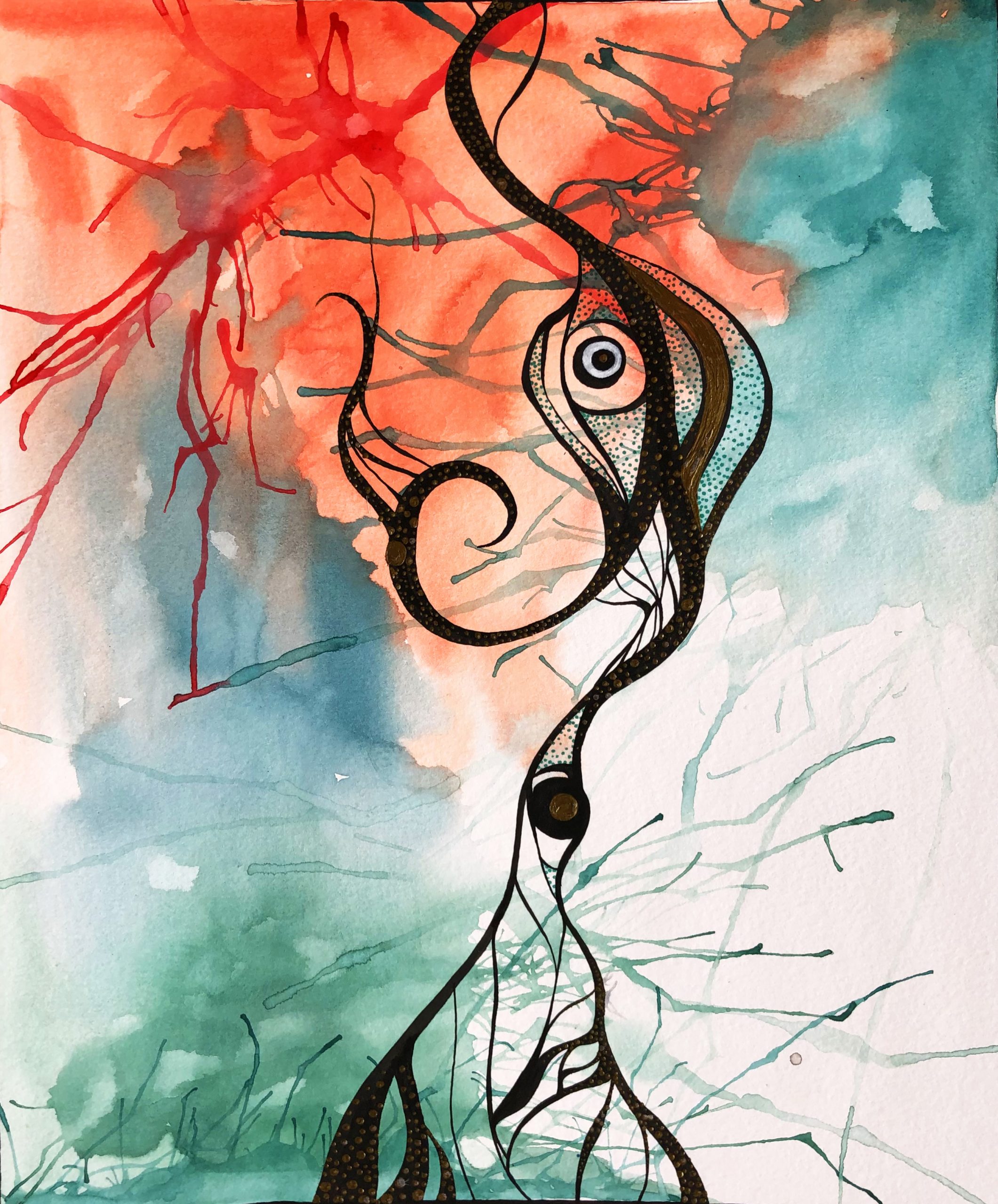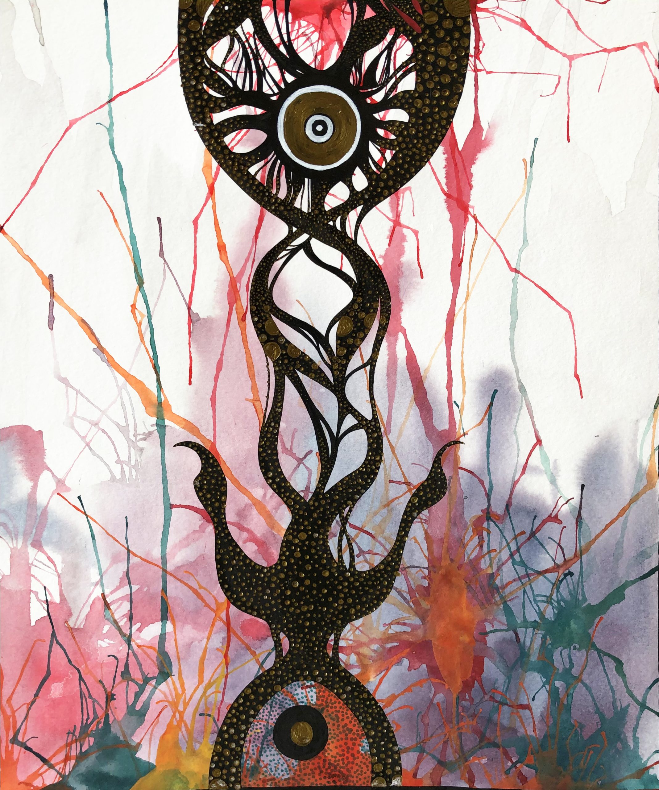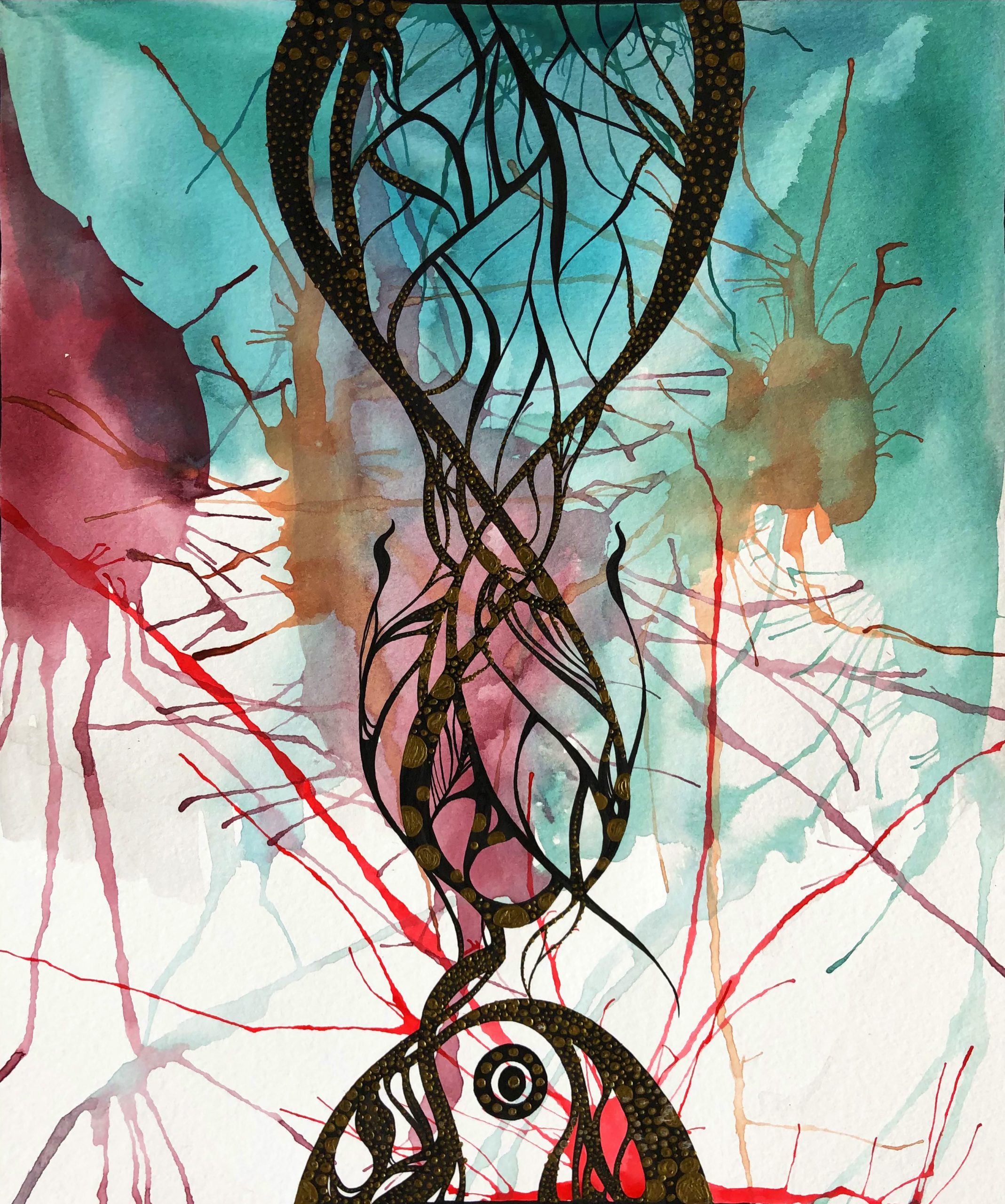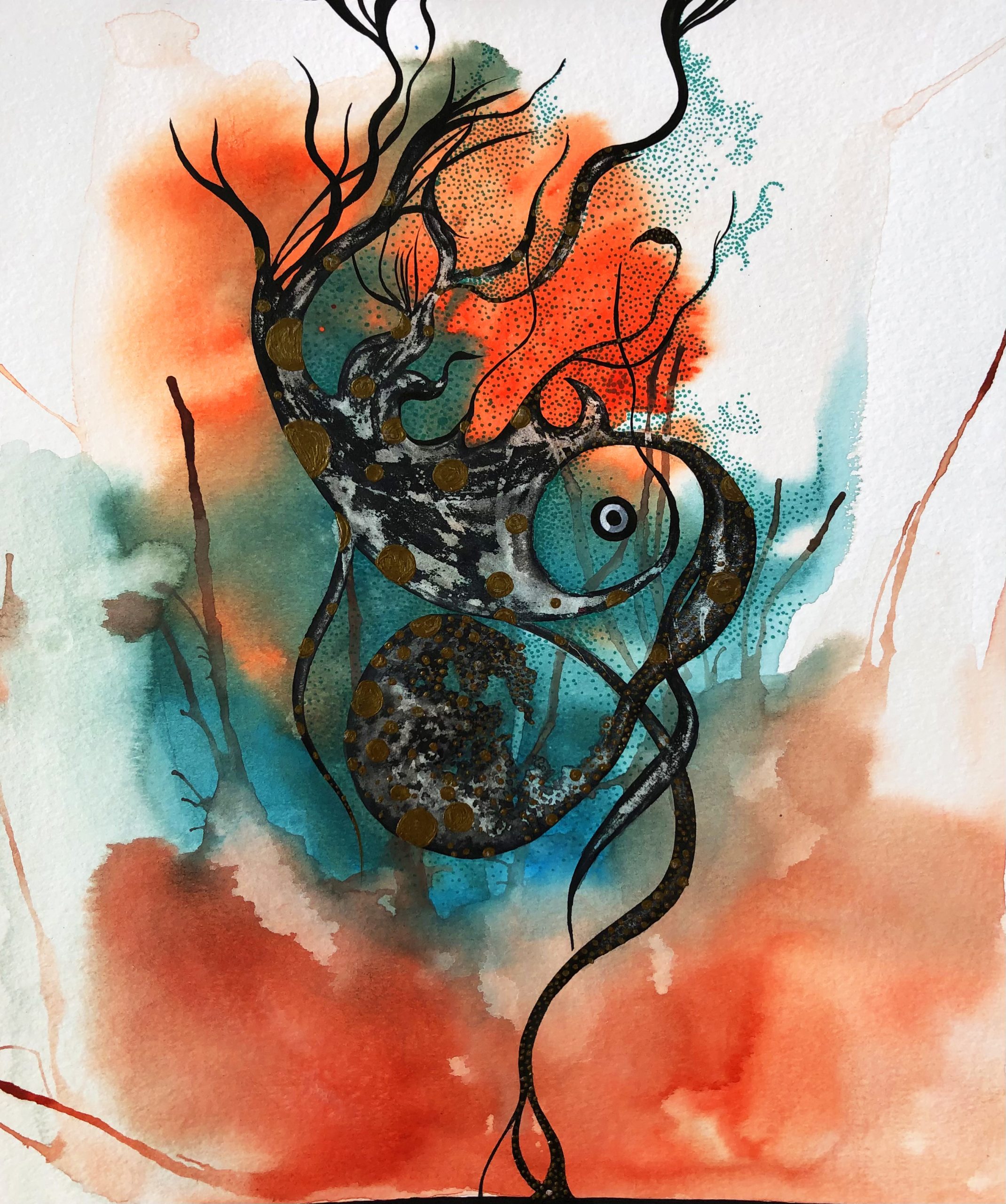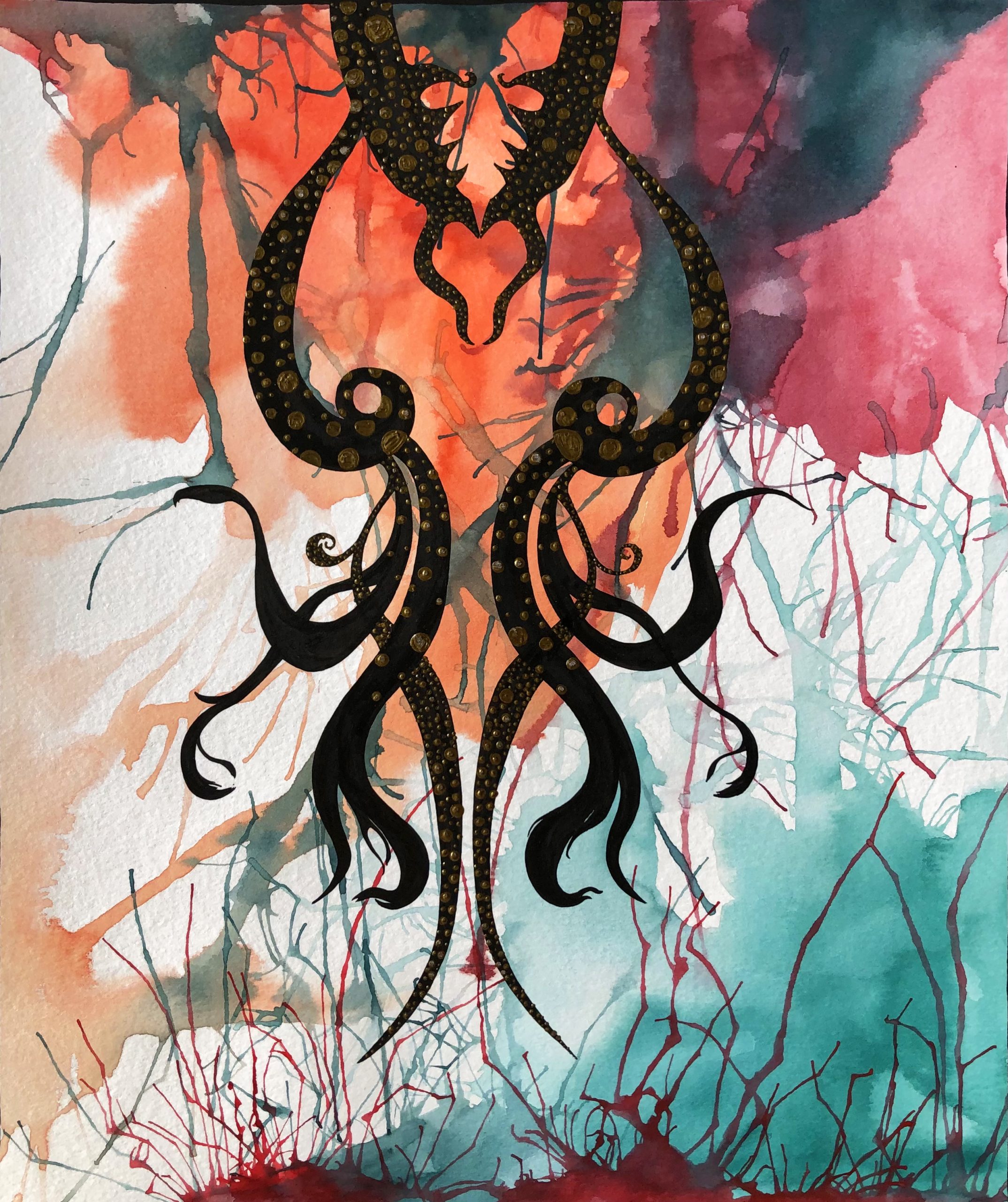 Las imágenes de la serie «Profundidades» han sido realizadas con tinta negra, acuarela y pintura dorada texturizada.